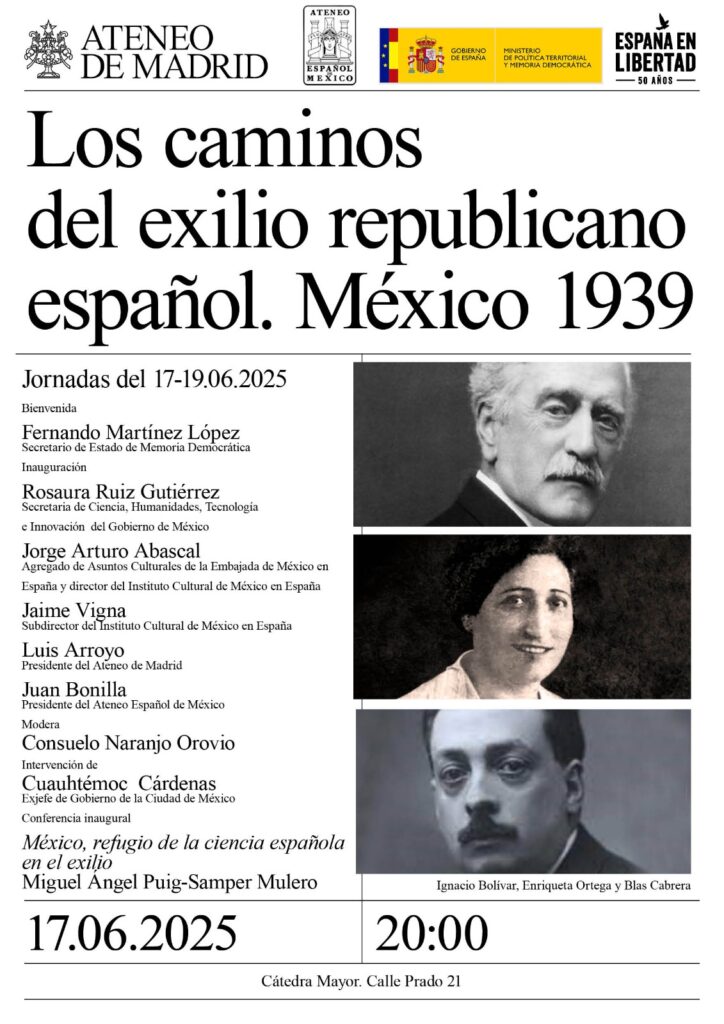 Con el objetivo de conocer a fondo la histioria de lazos entre México y España, El Ateneo de Madrid invita a toda la comunidad de diplomáticos, intelectuales, científicas y científicos de este estrecho vínculo, al foro “Los caminos del exilio republicano español. México 1939” a realizarse del 17 al 19 de junio de 2025, en Madrid, España.