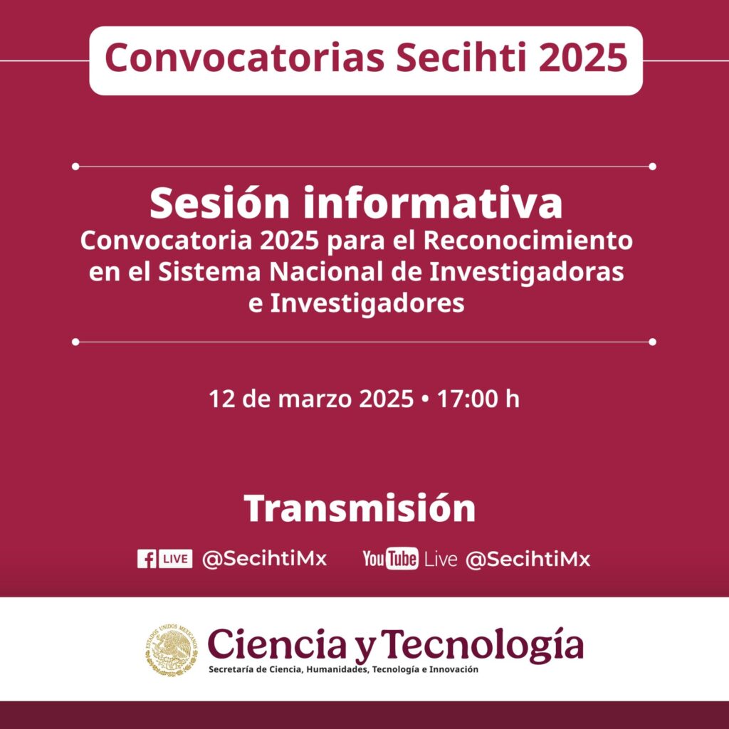 En el marco de la apertura de la Convocatoria 2025 para el Reconocimiento en el Sistema Nacional de Investigadoras e Investigadores (SNII), la Secihti organiza la “Sesión informativa Convocatoria 2025 para el Reconocimiento en el SNII”.